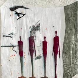 Screen print interpretations are superficially accentuated by free embroidery/sewing with a sewing machine.